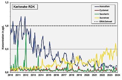 Die beiden wichtigsten Stoffe sind Acesulfam und Sucralose mit den höchsten Konzentrationen in den Gewässern. In den letzten Jahren sind im Oberrhein bei Karlsruhe eine Abnahme der Acesulfam-Konzentrationen und ein Anstieg der Sucralose-Gehalte erkennbar.